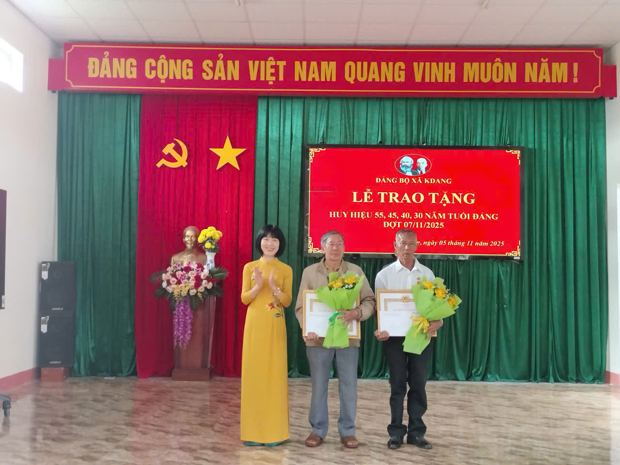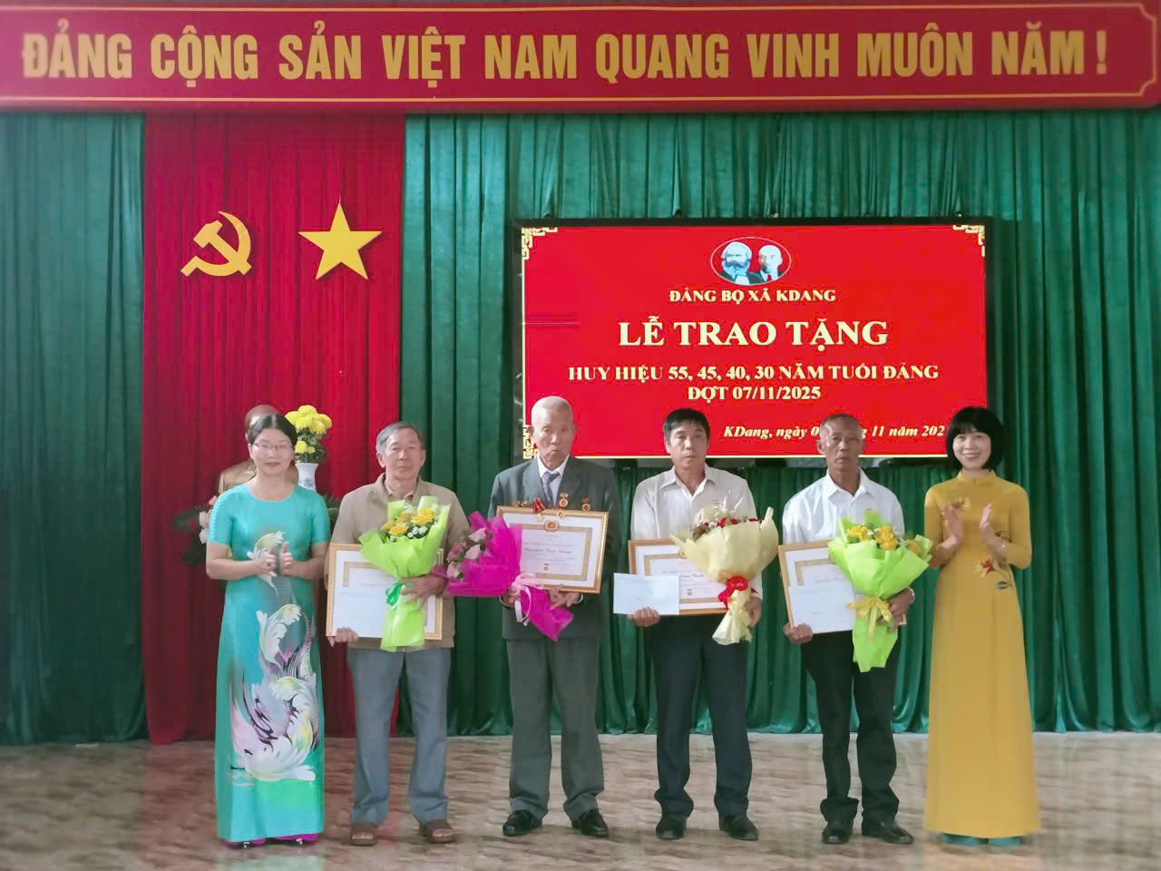 Sáng ngày 05/11/2025, tại Nhà Văn hóa xã, Ban Thường vụ Đảng ủy xã KDang đã long trọng tổ chức Lễ trao tặng Huy hiệu 55, 45, 40 và 30 năm tuổi Đảng cho các đồng chí đảng viên ưu tú, đợt kỷ niệm 07/11/2025.