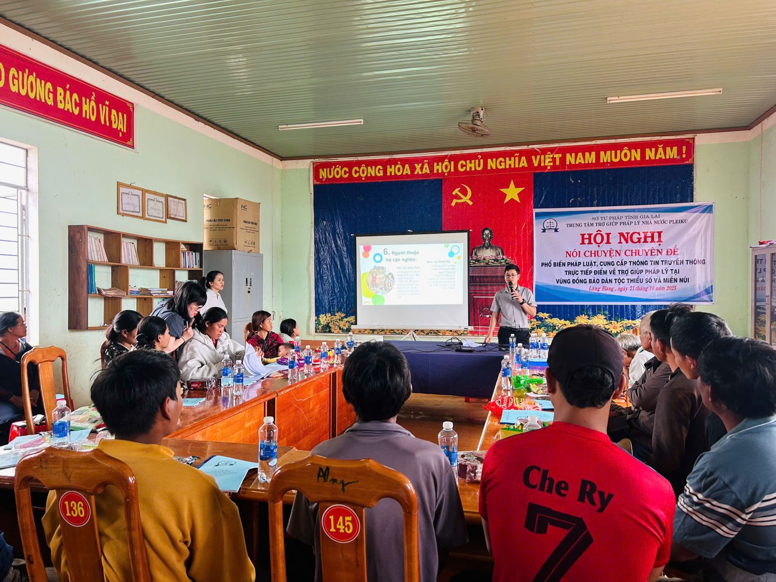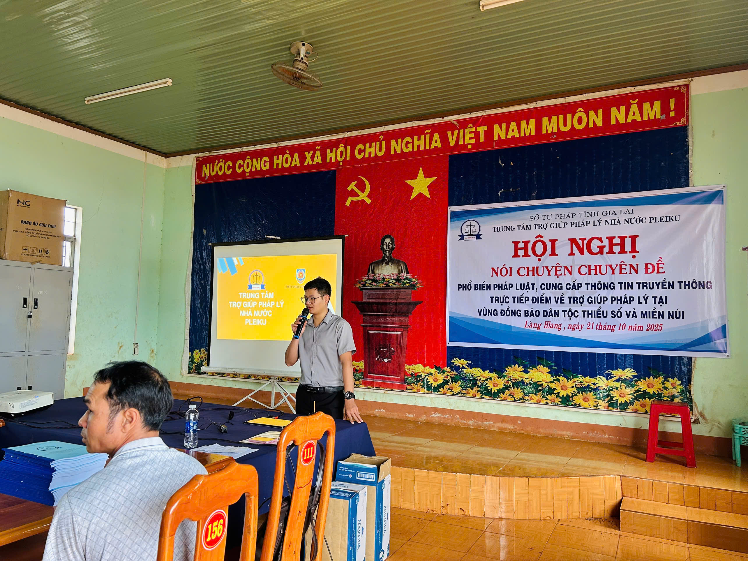 Ngày 21/10/2025, tại nhà văn hóa Làng HLang (xã KDang, tỉnh Gia Lai), Trung tâm Trợ giúp pháp lý nhà nước Pleiku (Trung tâm) đã tổ chức "Hội nghị nói chuyện chuyên đề phổ biến pháp luật, cung cấp thông tin truyền thông trực tiếp điểm về trợ giúp pháp lý tại vùng đồng bào dân tộc thiểu số và miền núi".